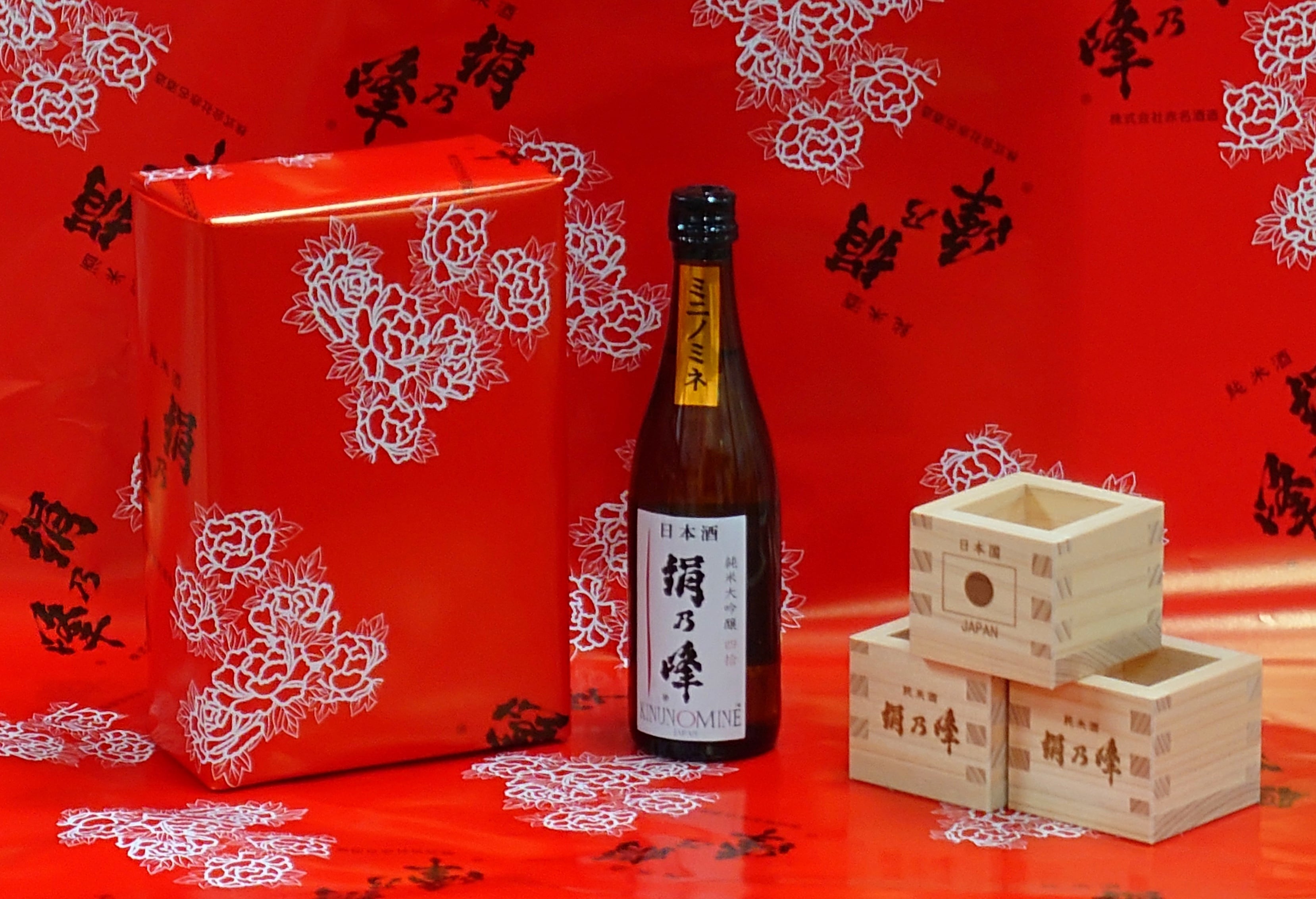純米大吟醸四拾ミニノミネ100mlとミニ枡3個絹乃峰ロゴと日章旗焼印入り 箱入り包装済み 袋付