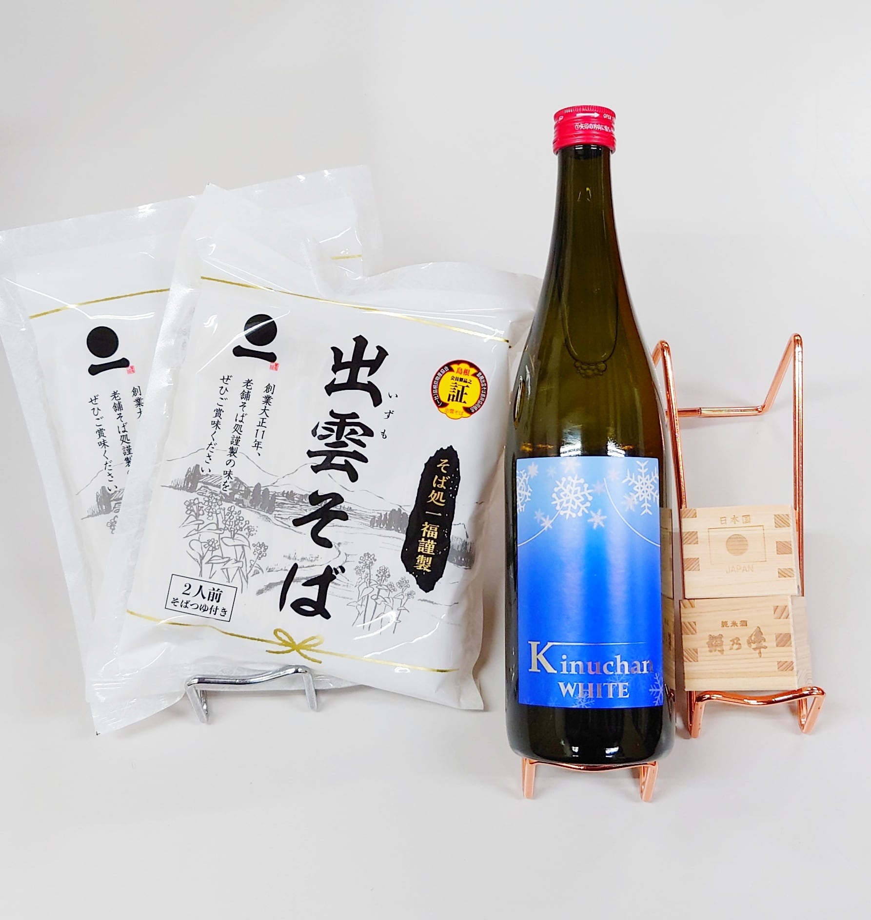 この冬、特別な時間を過ごすための12月限定セットが登場しました!贅沢な『きぬちゃんホワイト』1本と、一福の出雲そばを2人前×2、さらに絹乃峰日の丸ミニマスが2本ついてお得な価格でご提供します。このセットで、年末の特別なひとときを彩りましょう!