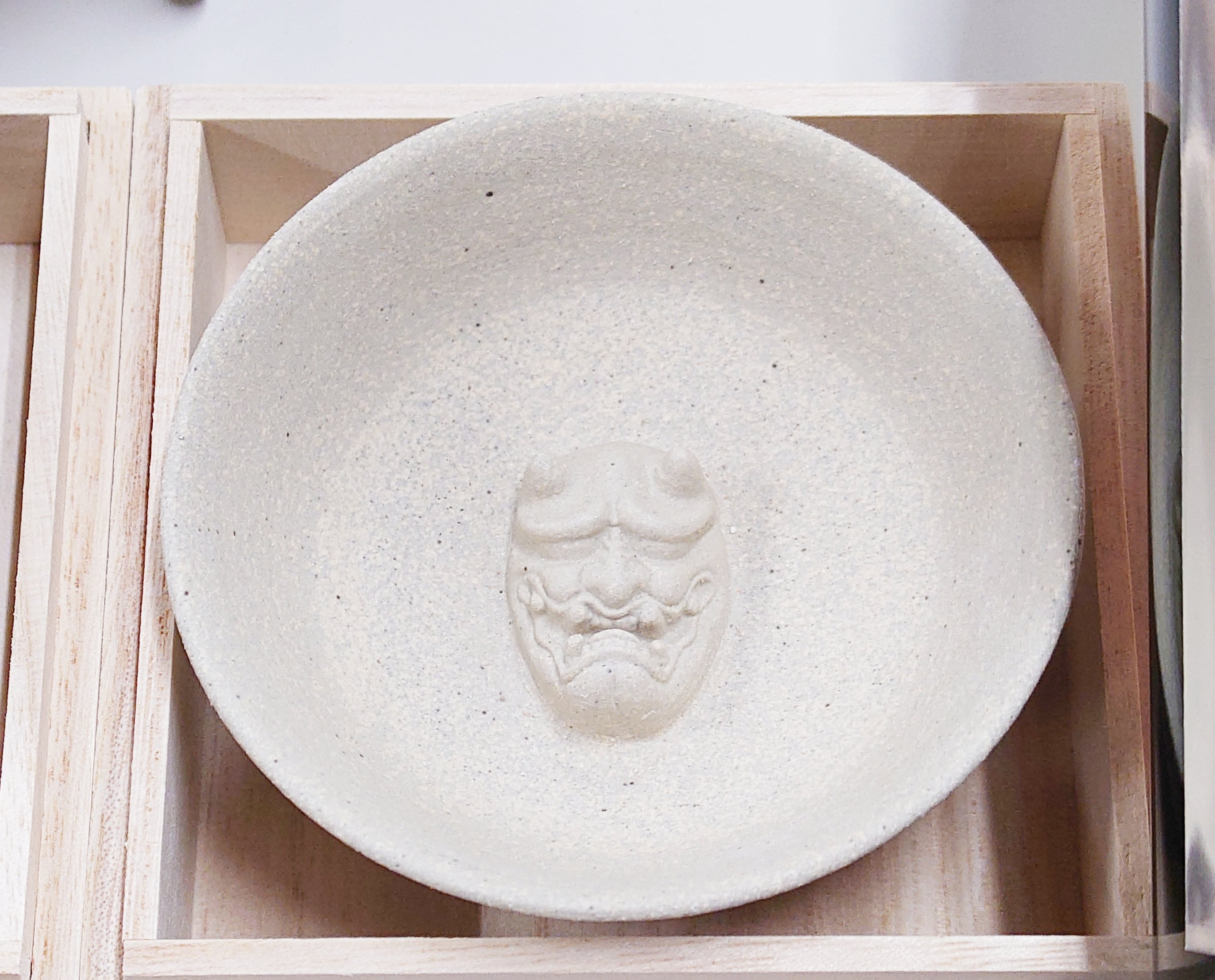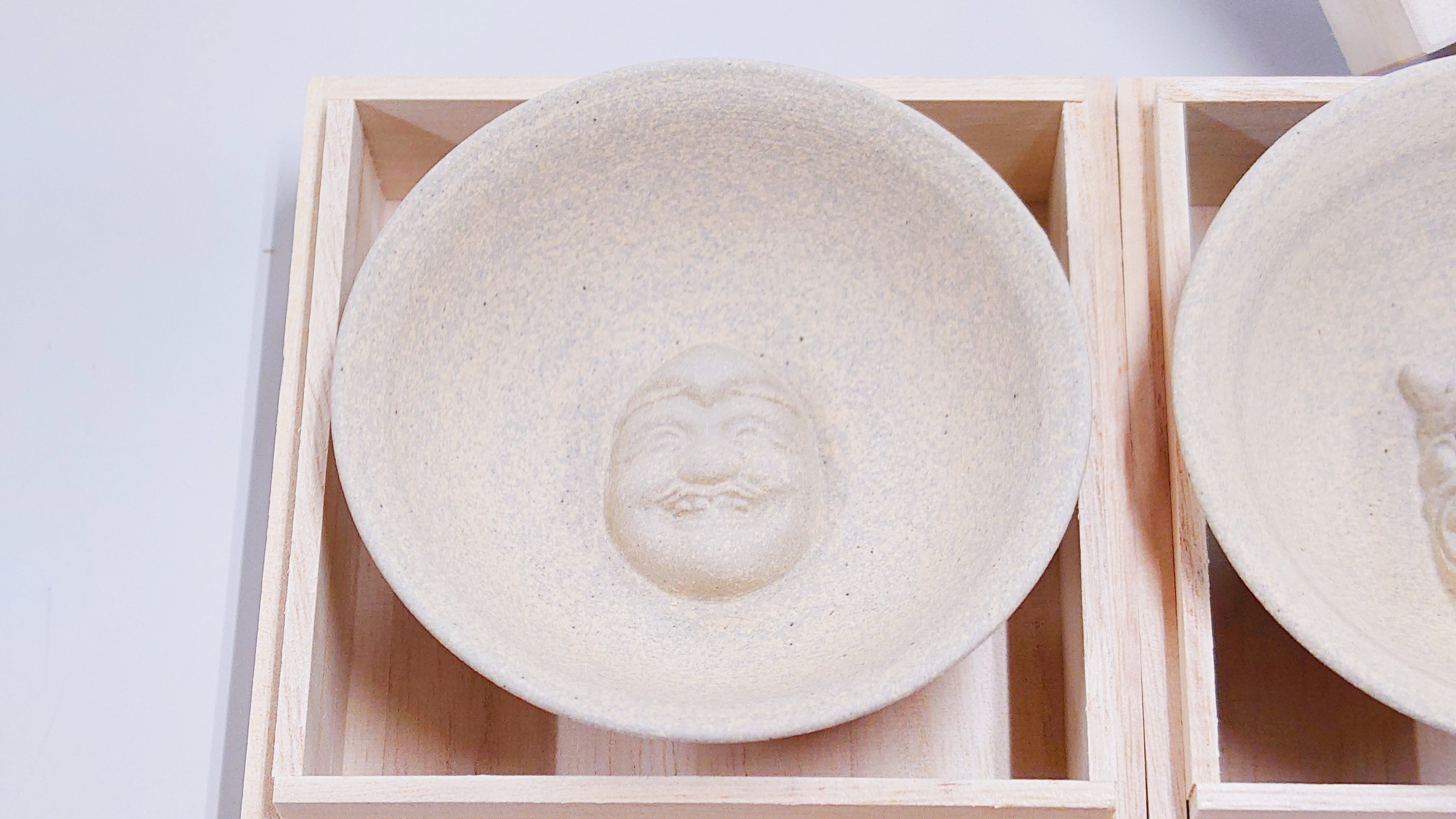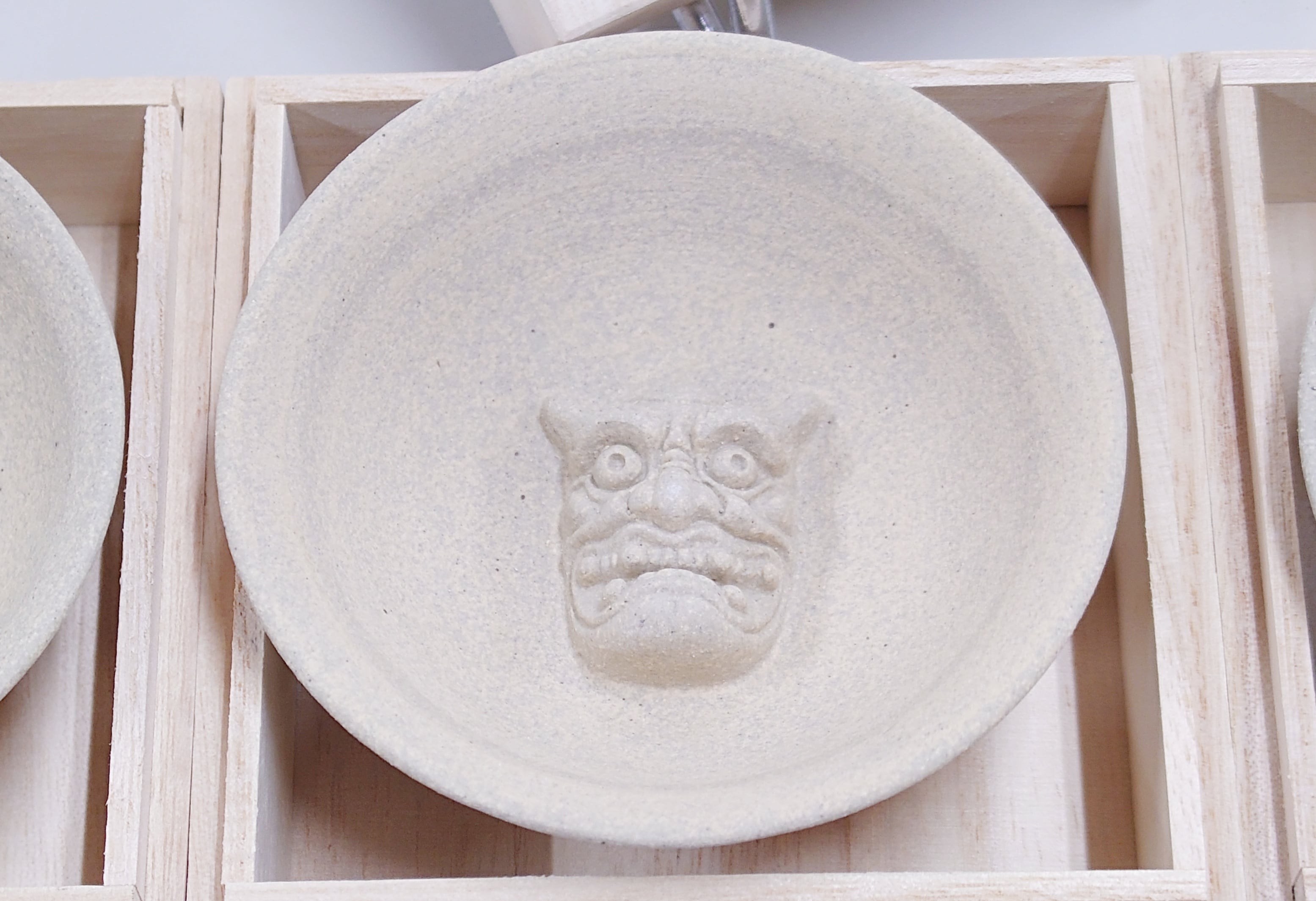 - 【神楽面平盃】は、島根県石見地方の瓦メーカー、有限会社亀谷窯業が製造する工芸品であり、神楽の舞台を飾る美しい面をモチーフにした特別な盃。飲む度に神楽の世界観を感じられる逸品です。飲み物を注ぐことで、さらなる楽しみが広がります。